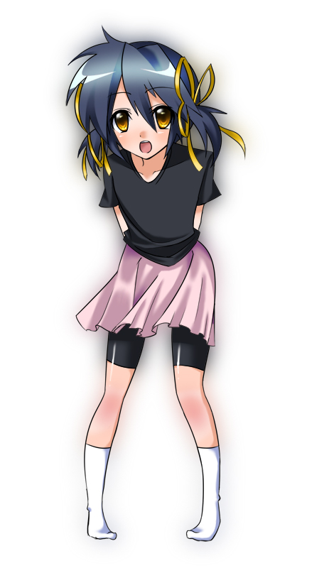 00s1girlarms behind backbike shortsblue haircasualchildfemale focushair ribbonkneehighsleaning forwardlooking at vieweropen mouthpigeon-toedribbonsimple backgroundskirtsockssolostandingtwintailswhite backgroundwhite socksyellow eyes