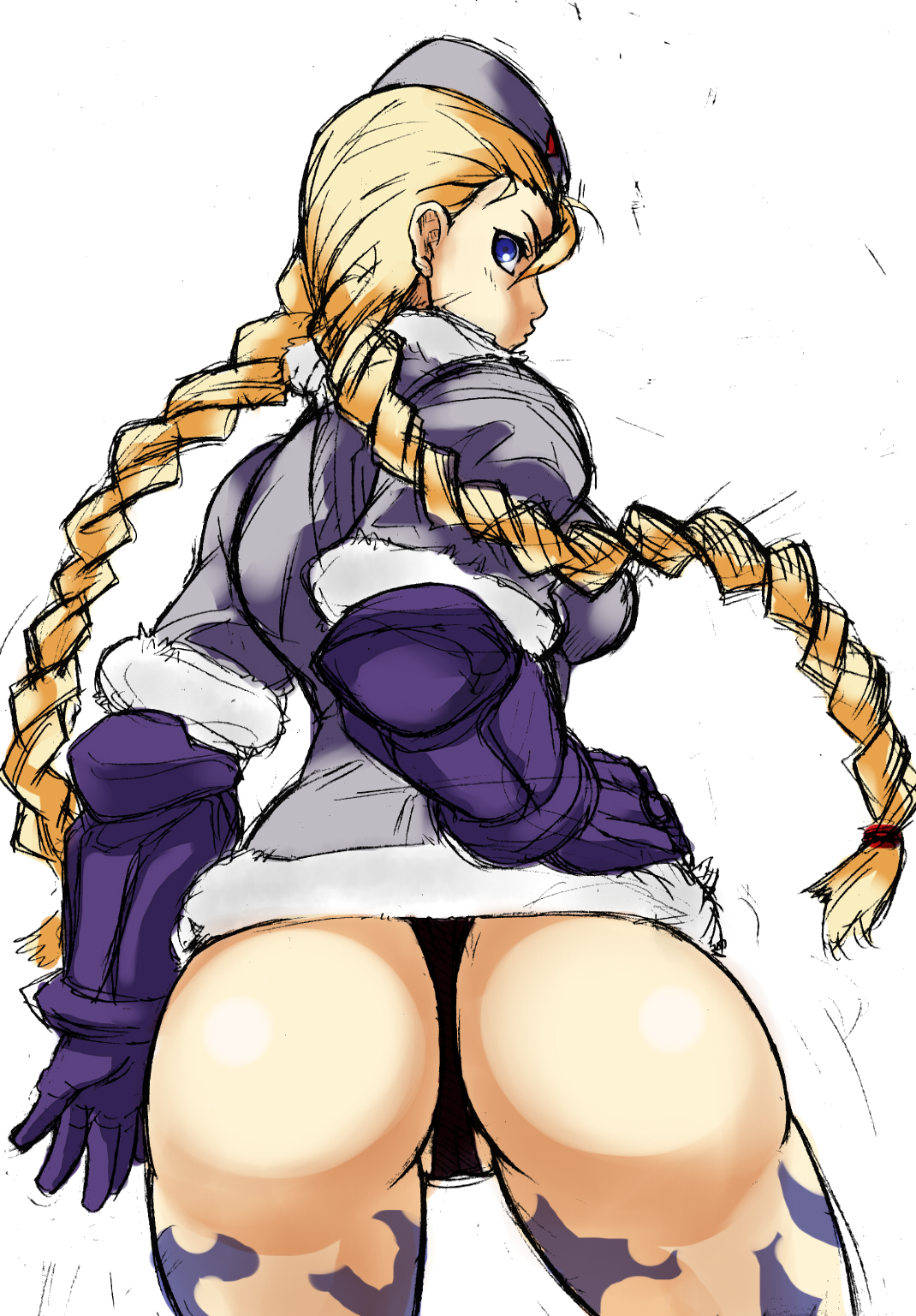 1girlassblue eyesbraidfemale focusfrom behindgarrison caphand on own hiphatleotardlooking backsketchsolothong leotardtwin braids
