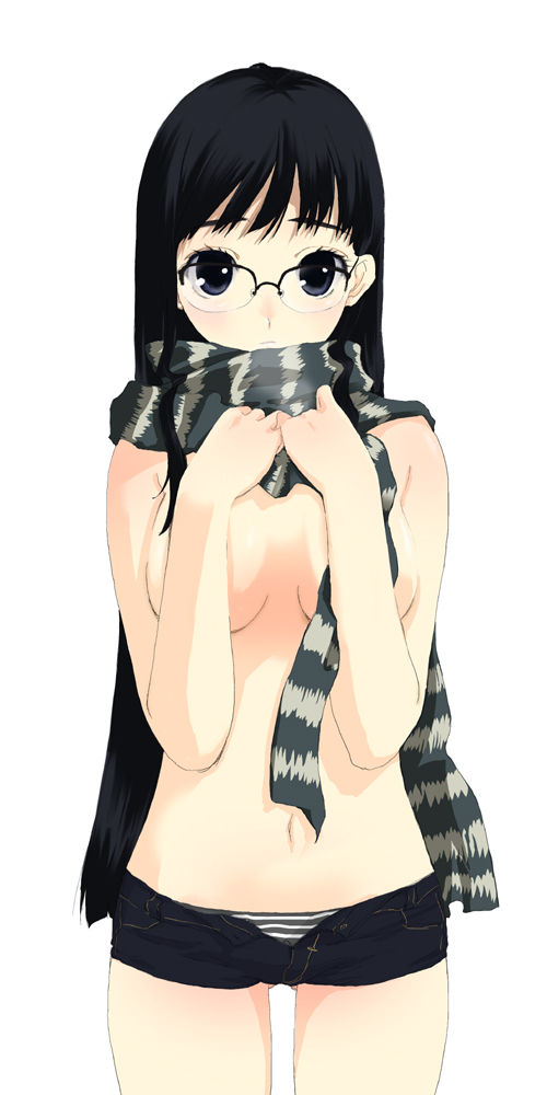 1girlblack hairblue eyesbreastscleavagecovering breastscovering privatesfemale focusglasseslong hairnavelpantiesscarfshort shortsshortssimple backgroundsolostriped clothesstriped pantiesstriped scarfunderwear
