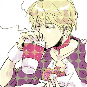 1boyblonde hairclosed eyescoffeedonutfoodmale focusshort hairsimple backgroundsolowhite background