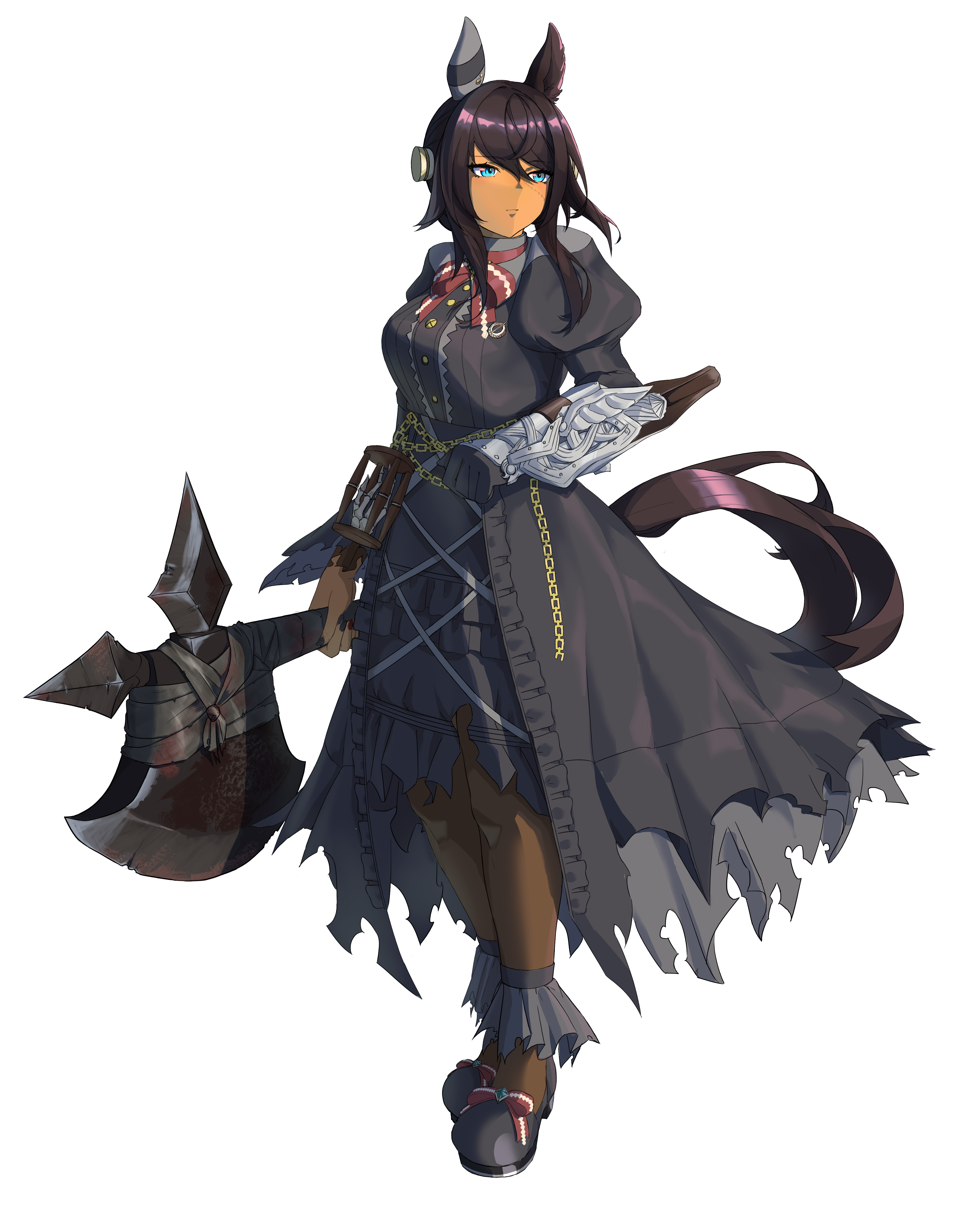 1girlanimal earsaxeblack bootsblack dressblack hairblack nailsblack pantyhoseblue eyesblushbootsbowbreastsclosed mouthdark skindark-skinned femaledressear coversfull bodygemgold trimhair ornamenthorse earshorse girljuliet sleeveslong hairlong sleeveslooking at viewermedium breastsobject through headofficial alternate costumeofficial alternate hairstylepantyhosepuffy sleevesred bowscrew in headsimple backgroundsingle ear coversmilesolotransparent backgroundweapon