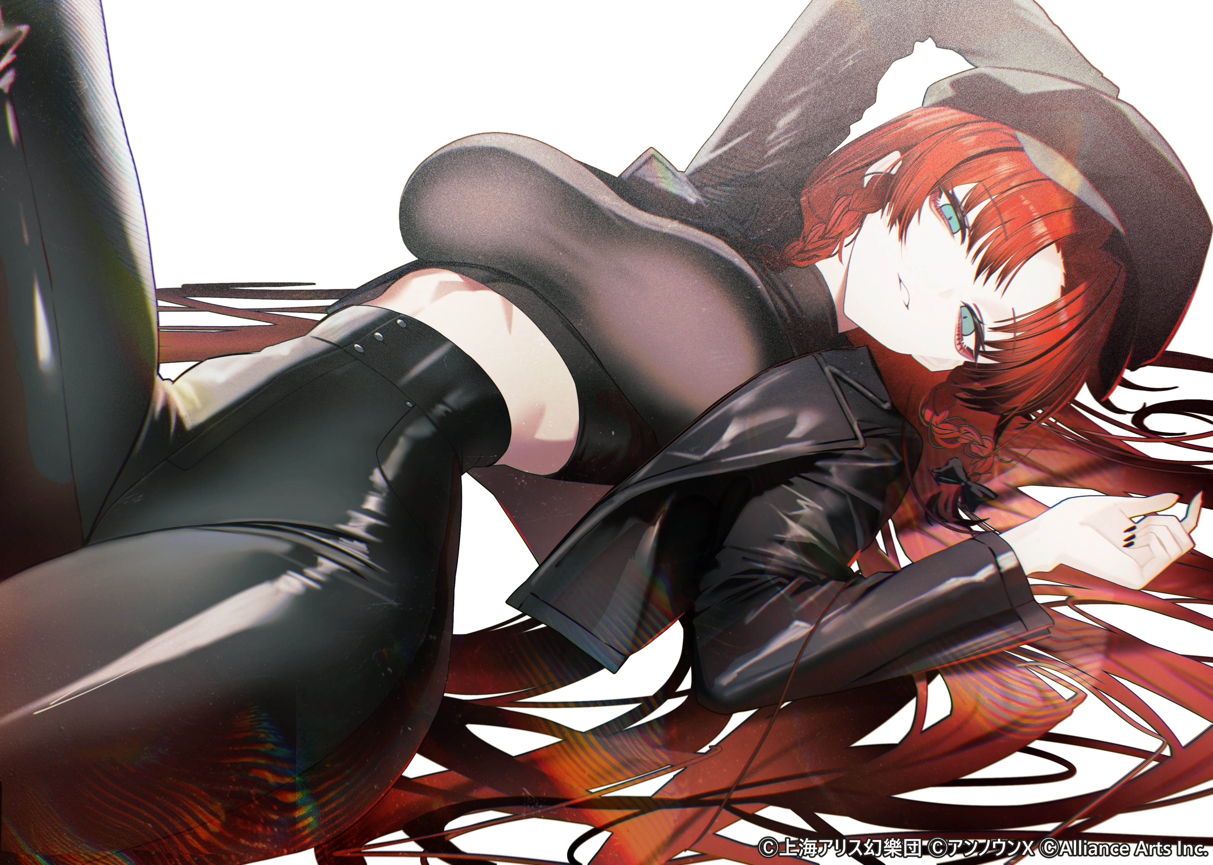 1girlalternate costumearm behind headblack bowblack hatblack jacketblack nailsbowbraidbreastscopyright noticecrop topcropped jacketeyeshadowgreen eyeshair bowhathigh-waist pantsjacketlarge breastslatex pantslong hairlong sleeveslooking at viewerlyingmakeupon backpantsred eyeshadowred hairsmilesoloswept bangsteeththighstight clothestight pantsturtlenecktwin braidsvery long hairwhite background