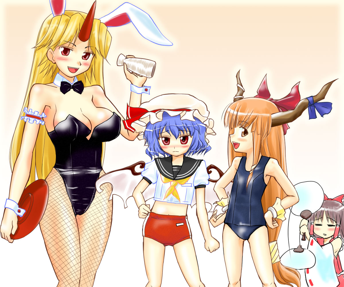 4girlsanimal earsarm garterbat wingsblonde hairblue hairblushbottleburumacosplayfemale focusfishnet pantyhosefishnetshand fanhand on own hiphands on own hipshathip focushornskemonomimi modelong hairmidriffmultiple girlsone-piece swimsuitorange eyesorange hairpantyhoseplayboy bunnyrabbit earsred eyesschool swimsuitschool uniformserafukushort hairsingle hornswimsuitwings