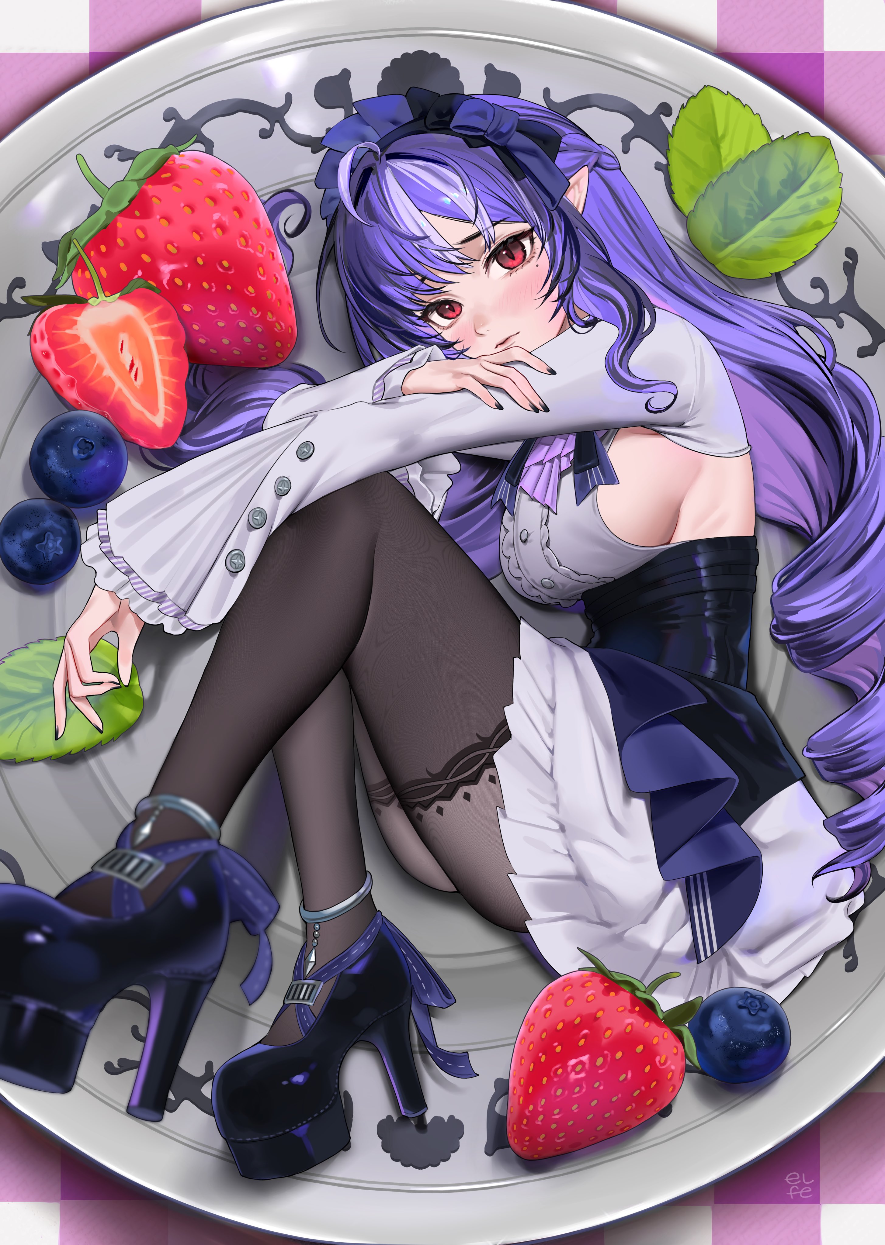 1girlblack pantyhoseblack shoesblackberry (fruit)breastsclosed mouthdressdrill hairfetal positionfoodfruithigh heelslarge breastslong hairlooking at viewerlyingmini personminigirlon plateon sidepantyhosepointy earspurple hairred eyesshoesshrug (clothing)sideboobsolostrawberrywhite dresswhite shrug
