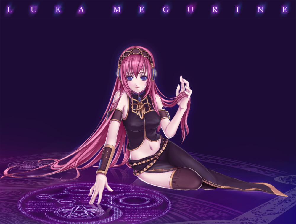 1girlblue eyesfemale focusheadphoneslong hairmagic circlemidriffnavelpentagrampink hairpurple backgroundsolothighhighsvery long hair
