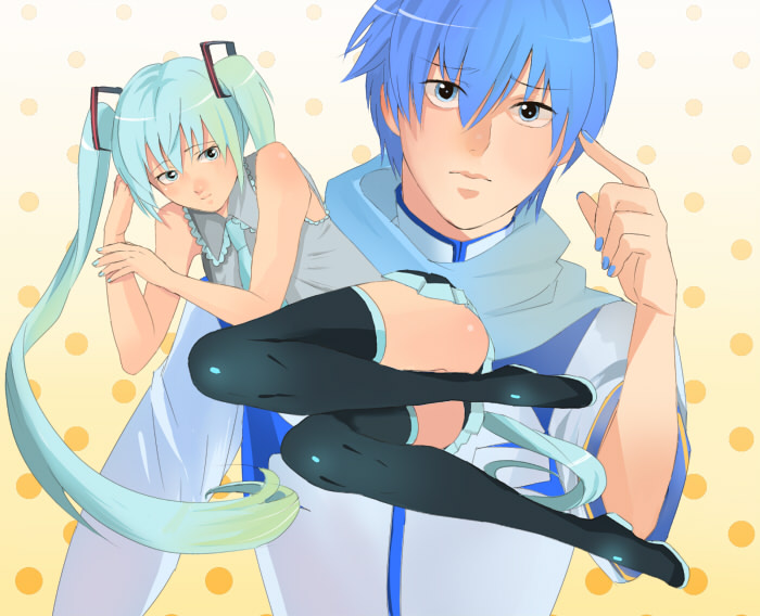 1boy1girlaqua eyesaqua hairblue eyesblue hairblue nailsblue scarfcensoredconvenient censoringconvenient leglong hairnail polishnecktiescarfskirtthighhighstwintailsvery long hair