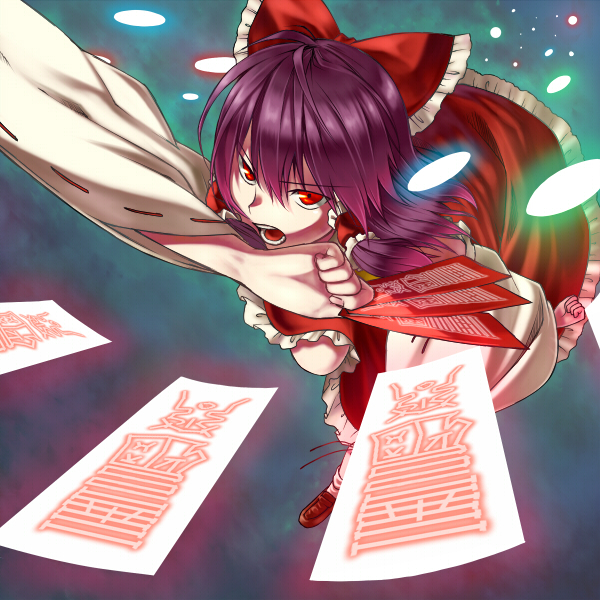 1girlattackdanmakufemale focusgradient backgroundgradient hairjapanese clothesmikomulticolored hairofudared eyesshort hairsolo
