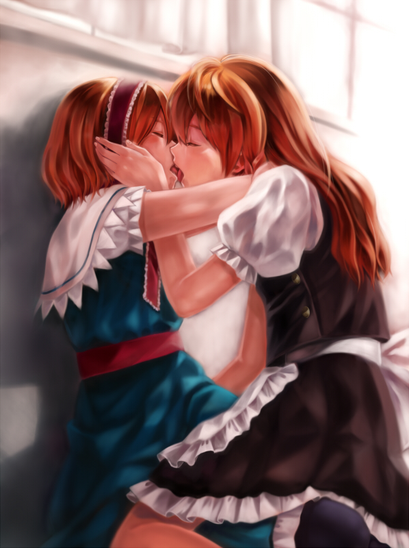 2girlsagainst wallblonde hairbraidclosed eyesfemale focusfrench kisshairbandhand on another's cheekhand on another's facehugkissmultiple girlsno headwearorange hairshort hairtongueyuri