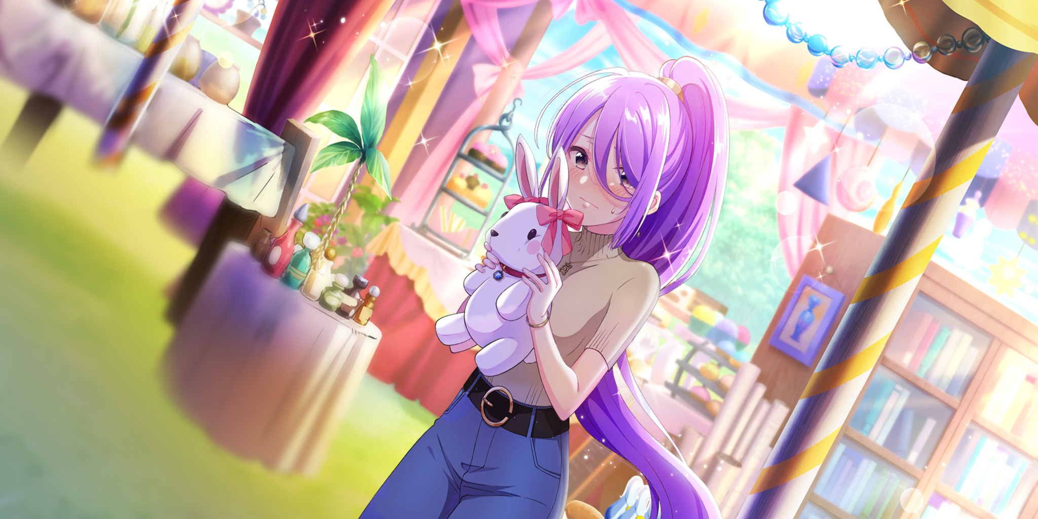 1girlbeltblack beltblue pantsblushbookshelfbottlebowbreastsbrown shirtcowboy shotdaydutch anglegreen eyeshair between eyeshigh ponytailholdingholding stuffed toyindoorslens flarelong hairlooking at viewermedium breastspantspink bowponytailpurple hairshirtshort sleevessidelockssmall sweatdropsolosparklestuffed animalstuffed rabbitstuffed toytabletableclothtiered trayvery long hairwindow