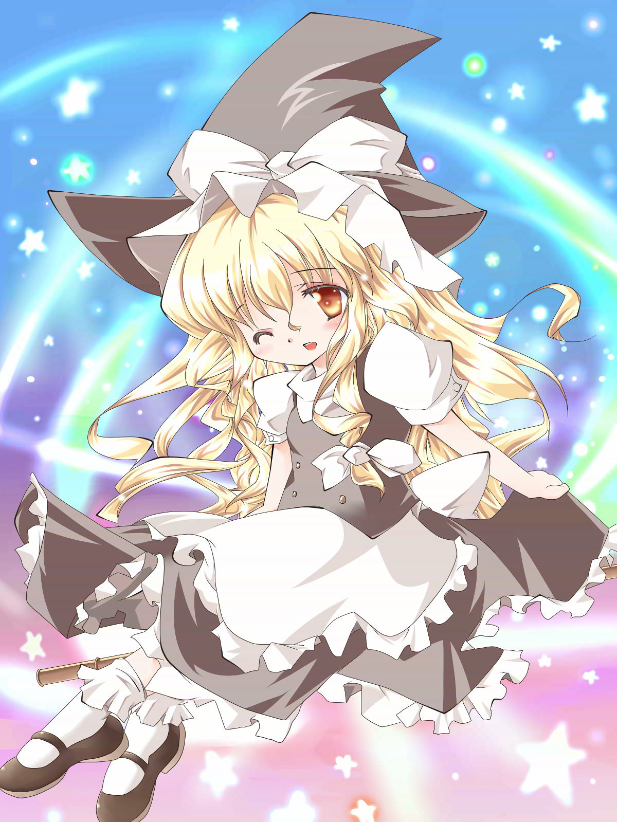 1girlblonde hairbraidbroombroom ridingfemale focusgradient backgroundhatlong hairone eye closedskirtsolostar (symbol)winkwitchwitch hatyellow eyes