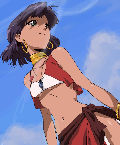 1990s (style)1girlbandeaubare shouldersbraceletclouddark skindark-skinned femaledayearringsfemale focusfrom belowgreen eyesjewelryloinclothmidriffneck ringnecklacepelvic curtainpurple hairretro artstyleshort hairskysmilesolostraplesstube topvest