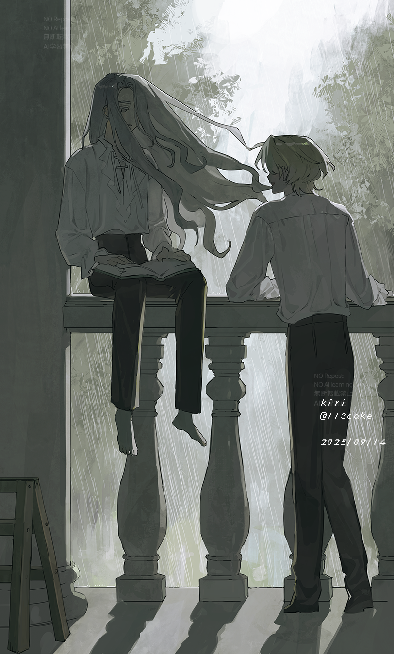 2boysbalusterbarefootblack pantsbookbook on lapdateddaygrey hairgrey shirtlong hairlong sleeveslooking at anothermale focusmultiple boysmuted coloropen bookoutdoorspantsparted lipsrainshirtshirt tucked inshort hairsittingslice of lifestandingvery long hairwatermark
