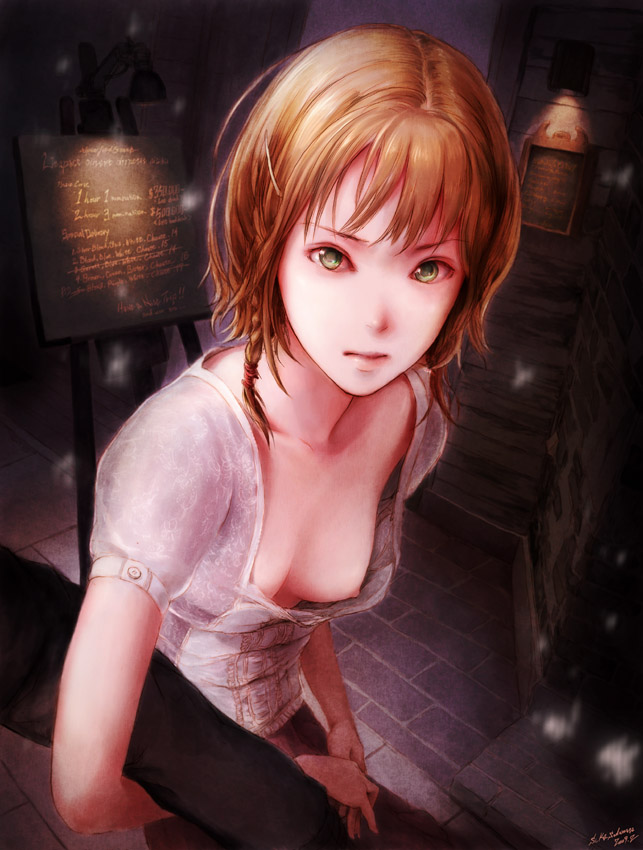 1girlbraidbreastsdownblousefemale focusgreen eyesnipple slipnipplesno braopen clothesopen shirtrealisticred hairshirtshort hairsolo