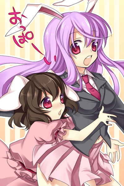 2girlsanimal earsbreastsbrown hairfemale focuslong hairmultiple girlspink eyespurple hairrabbit earsstanding