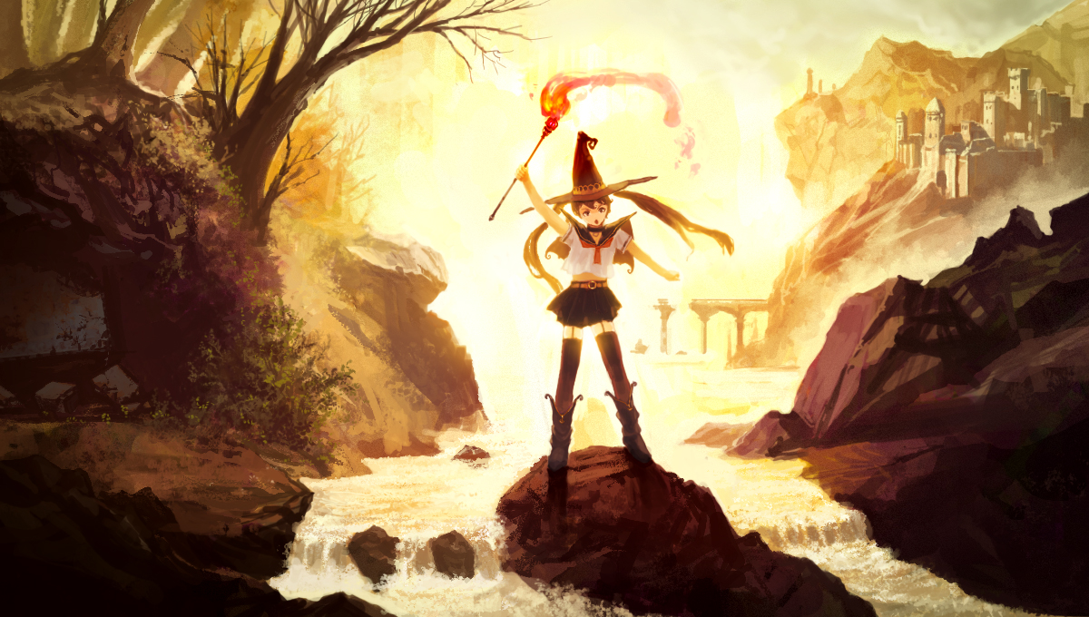 1girlarm upbootsfantasyfemale focusgarter strapshatlong hairmagicoutdoorsriverschool uniformserafukuskirtsolostandingstreamsunsetthighhighstorchtwintailswaterwitch hat