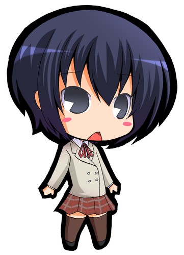 00s1girlblazerblue eyesblue hairblushchibifemale focusjacketmatching hair/eyespac-man eyesplaid clothesplaid skirtschool uniformshort hairskirtsolothighhighsvest