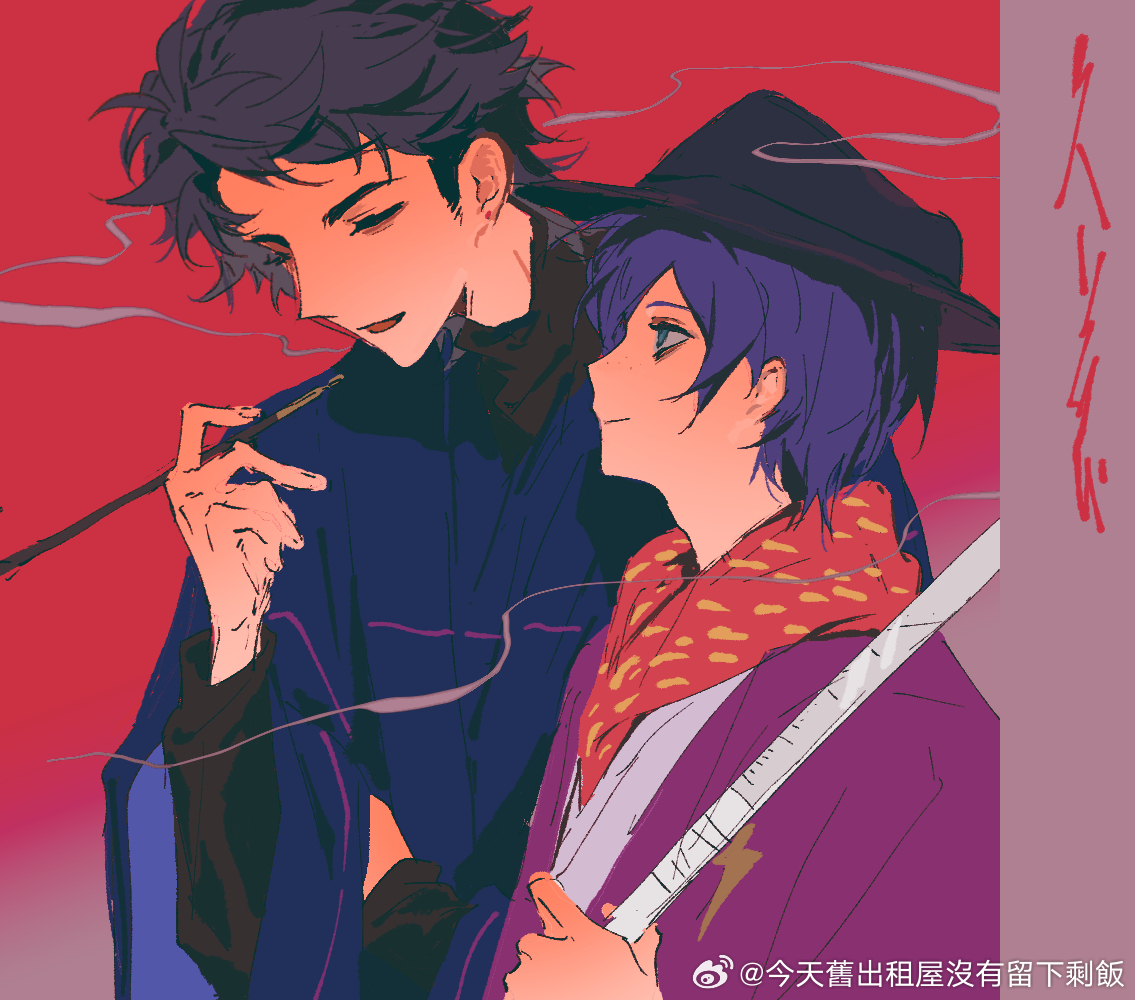 2boysalternate costumebags under eyesblack hairblack hatblue eyesblue hairblue kimonobrothersfreckleshatholdingholding rulerholding smoking pipejapanese clotheskimonolong sleevesmale focusmultiple boyspurple kimonored backgroundshort hairsiblingssideburnssmokingsmoking pipeupper bodywide sleeves