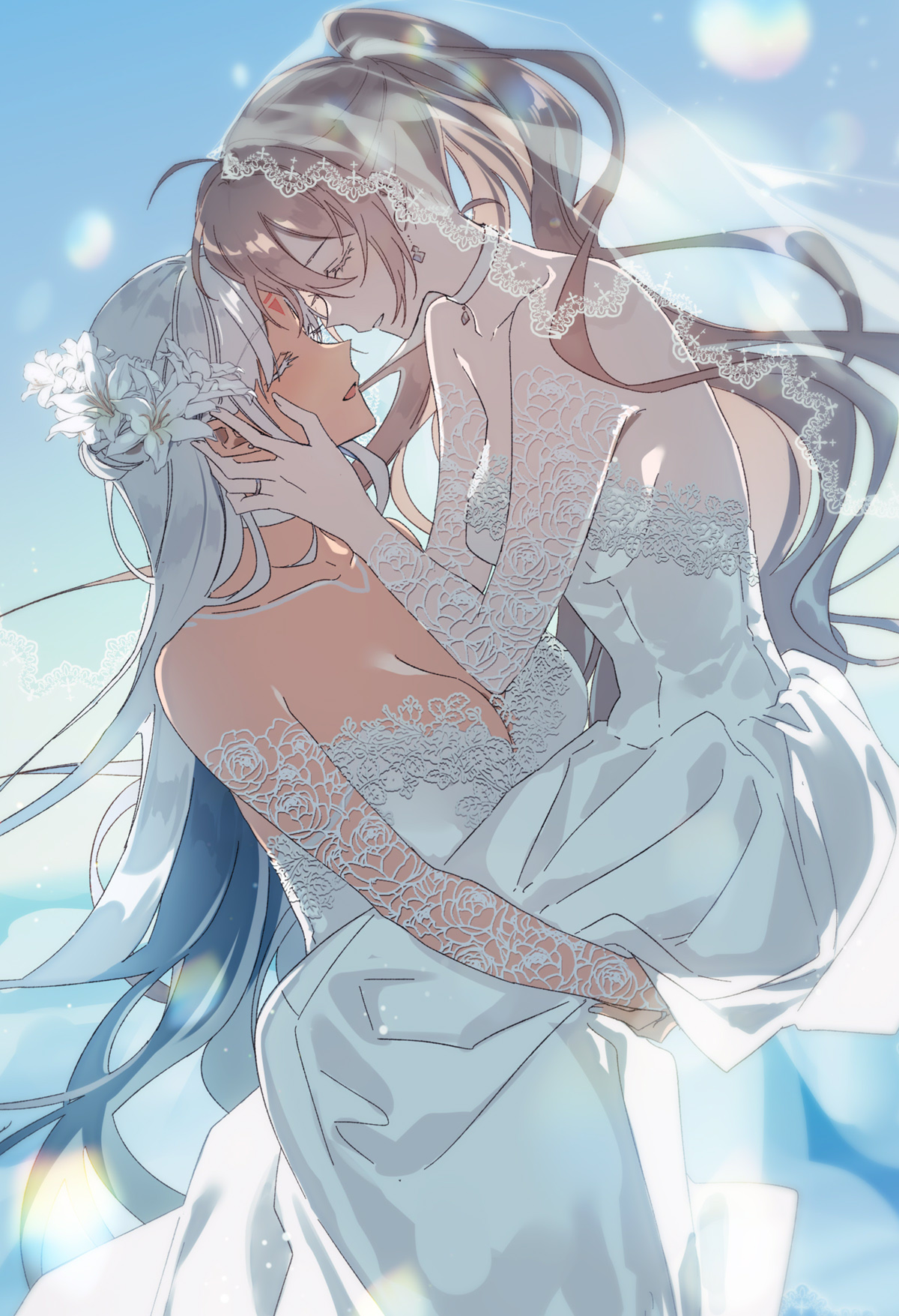 2girlsbreastsbridal veilbrown hairchokercleavageclosed eyescollarbonedressearringsfacial markflowerforehead markgrey hairhair flowerhair ornamenthand on own cheekhand on own facejewelrylifting personlong hairmultiple girlsnative americanopen mouthringstraplessstrapless dressveilwedding dresswedding ringwhite chokerwhite dresswhite flowerwife and wife