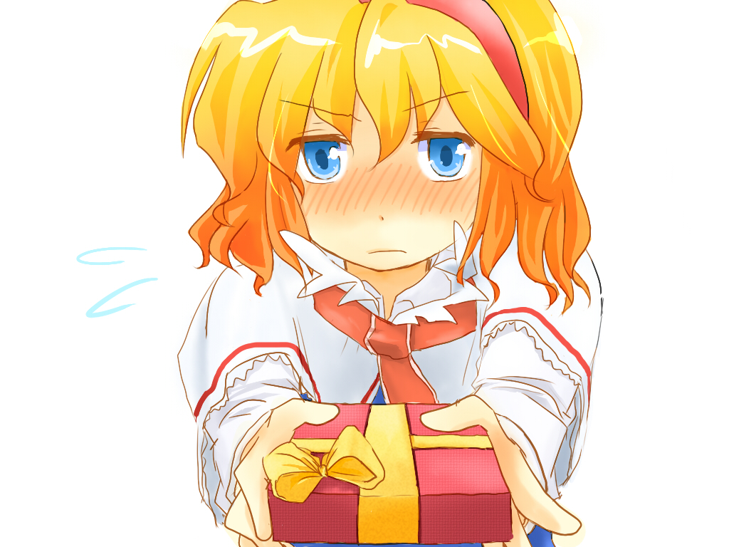 1girlblonde hairblue eyesblushfemale focusgifthairbandholdingholding giftribbonshort hairsolovalentine