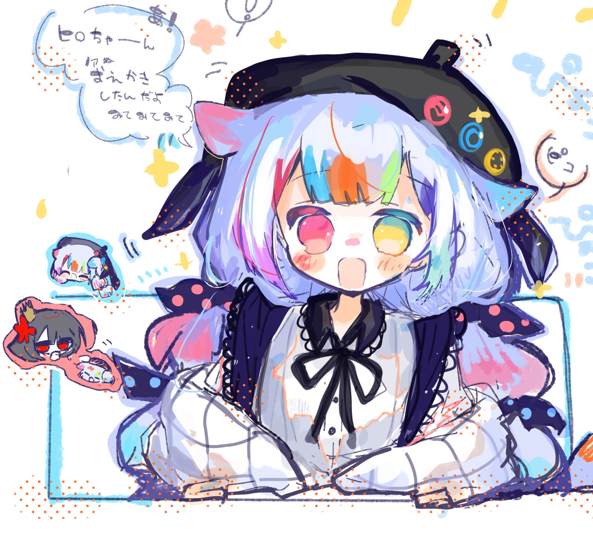 :d1girlanimal earsberetblack ribbonbowchibichibi insetcropped torsohatheterochromialong hairlooking at viewermulti-tied hairmulticolored hairneck ribbonopen mouthpolka dotpolka dot bowribbonsmilesolosparklespeech bubblestreaked hairtamagokake (torigya)upper bodywhite backgroundwhite hairyellow eyes