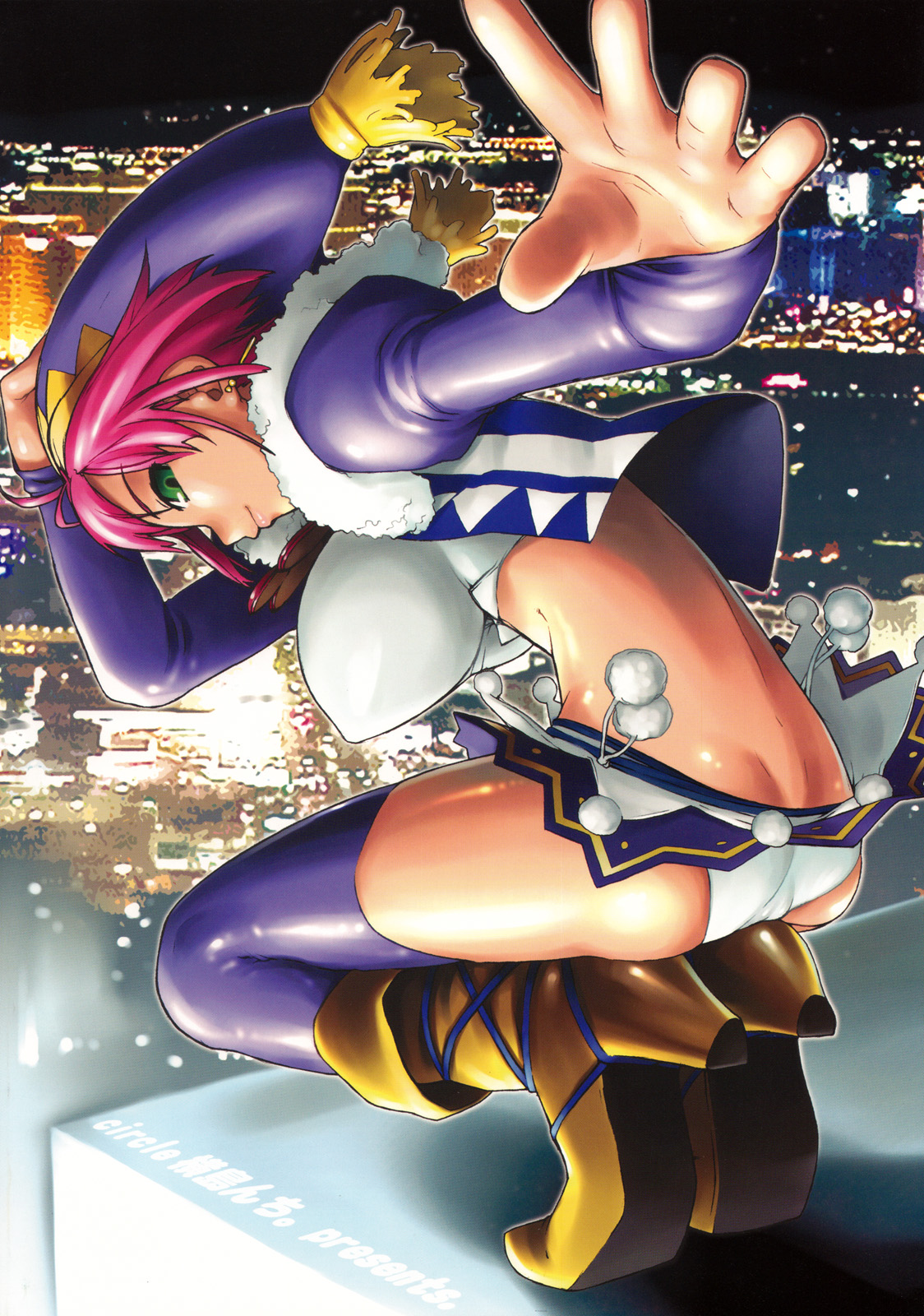 1girlassbreastscityclothes liftfemale focusforeshorteninggreen eyeshand on headwearhatjester caplarge breastsoutstretched handpink hairpurple thighhighsreachingshort hairsideboobskirtskirt liftsmilesolosquattingstraplessthighhighstube topvest
