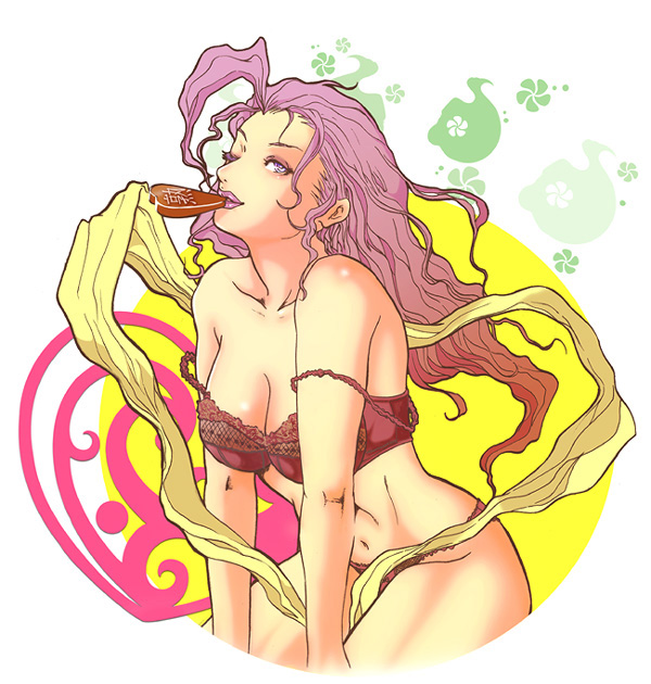 1girlblack brablack pantiesbrabreastschocolatecleavagefemale focushagoromohair slicked backheartlarge breastslingerielipstickmakeupmouth holdone eye closedpantiespurple eyespurple hairscarfshawlsingle hair intakesolostrap slipthick thighsthighsunderwearunderwear onlywink