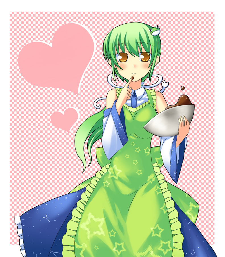 1girlalternate hairstyleaproncheckered backgroundchocolatefemale focusgreen hairhair ornamentheartponytailsnakesolostar (symbol)yellow eyes