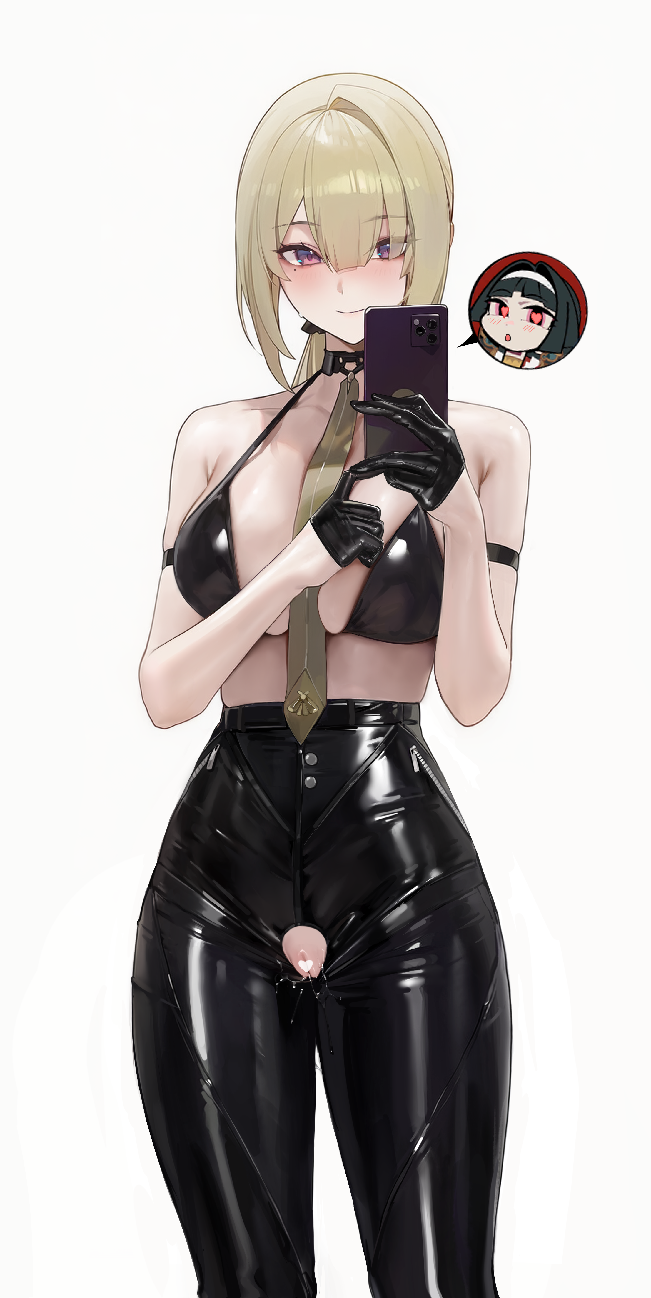 arm strapbare shouldersblack brablack glovesblack pantsblonde hairblushbrabreastscellphonecensoredclosed mouthcollarboneglovesgrey backgroundhair downhalf gloveshalterneckheartheart censorhigh-waist pantsholdingholding phonelarge breastslong hairlooking at viewermolemole under eyenecktiepantsphonepurple eyespussypussy cutoutpussy juice on facesimple backgroundsingle hair intakesmartphonesmilespoken characterunderwearyellow necktie