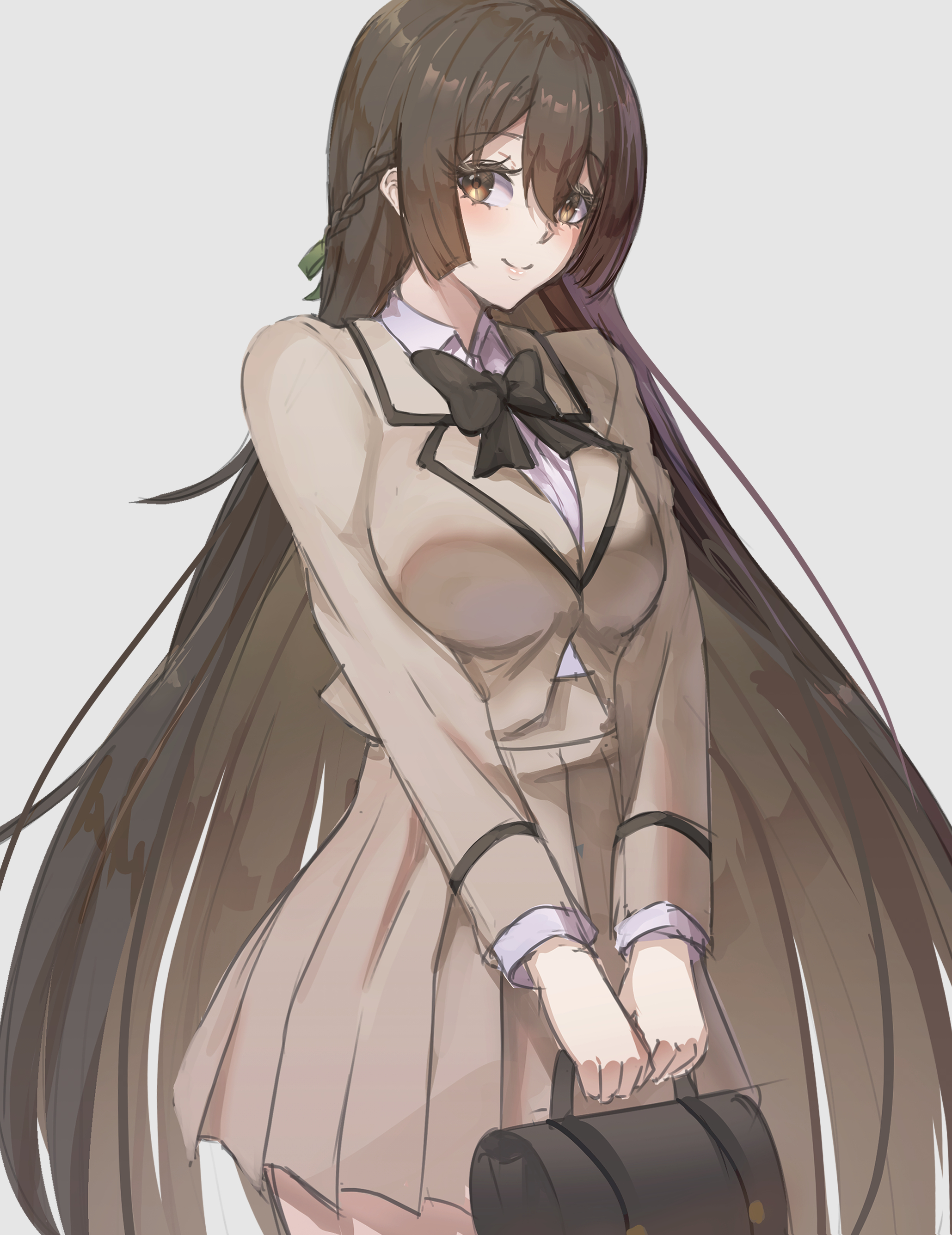 april jubilees, mejiro mcqueen (umamusume), formula one, mercedes-benz, umamusume, absurdres, highres, 1girl, animal ears, aqua bow, black bodysuit, bodysuit, bow, breasts, closed mouth, ear bow, floating, floating object, gloves, gradient bodysuit, grey bodysuit, hand on own chest, horse ears, horse girl, horse tail, long hair, long sleeves, looking at viewer, purple eyes, purple hair, racing suit, smile, solo, spoiler (automobile), tail