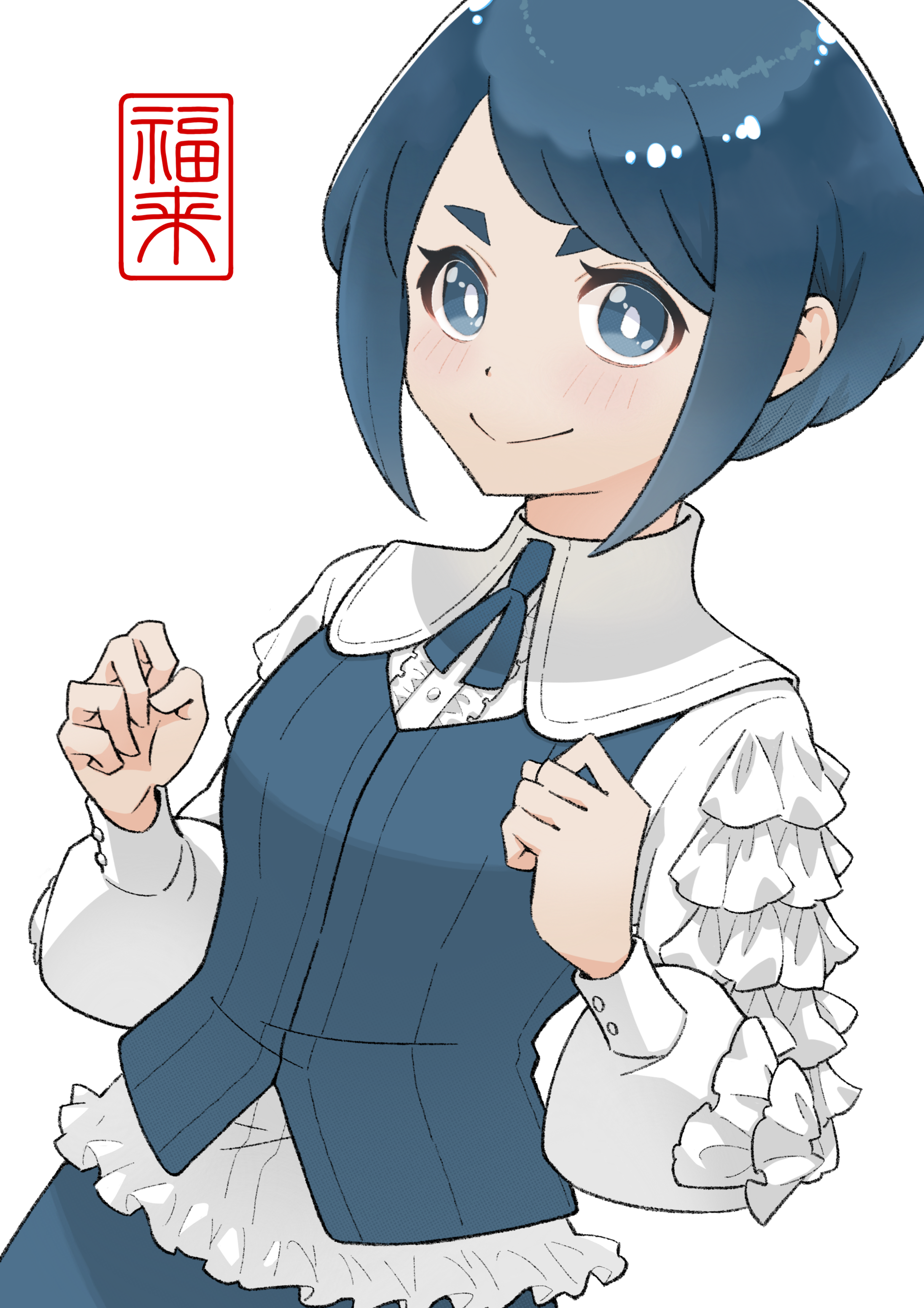 1girlblue eyesblue hairbright pupilsclosed mouthcollared shirtcowboy shotdutch anglefrilled shirtfrilled sleevesfrillslong sleeveslooking at viewerneck ribbonpuffy long sleevespuffy sleevesribbonshirtshort hairsimple backgroundsmilesoloswept bangsupper bodyvestwhite backgroundwhite shirt