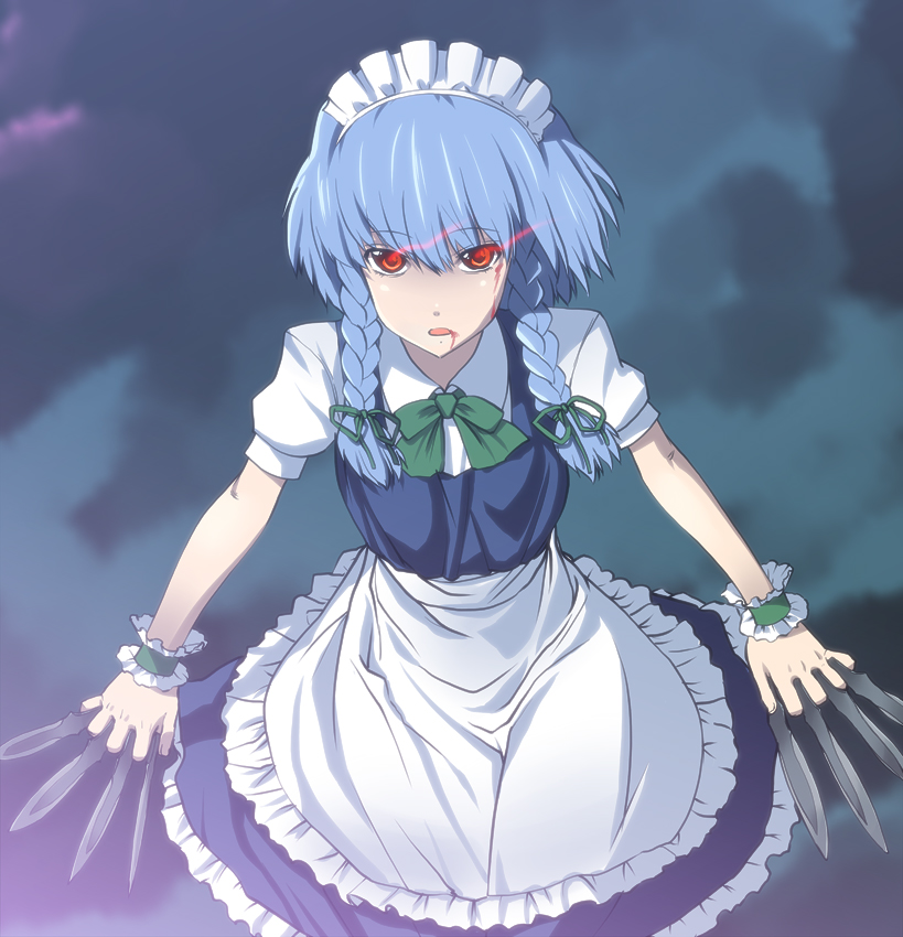 1girlbetween fingersbloodblood on faceblue hairbraideye trailfemale focushair ribbonholdingknifelight trailmaidmaid headdressred eyesribbonshort hairsolothrowing knifetwin braidsweaponwrist cuffs