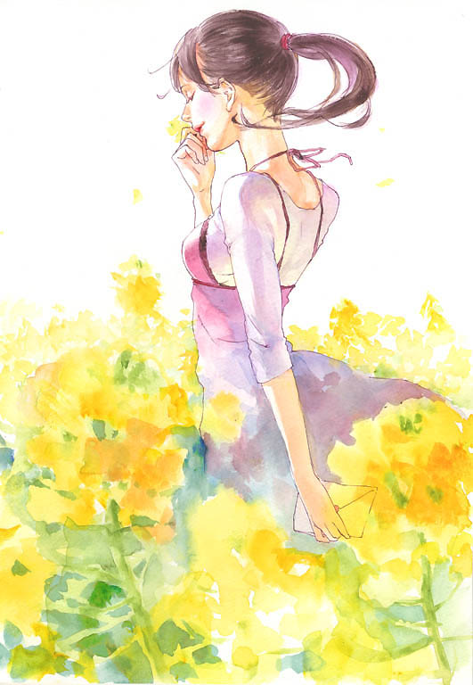 1girlblushbrown hairdressfemale focusfieldfloating hairflowerflower fieldfrom behindhalternecklong hairlong sleevespinafore dressponytailred dressshirtsimple backgroundsittingsleevelesssleeveless dresssolosuspenderswhite backgroundwhite shirtwind