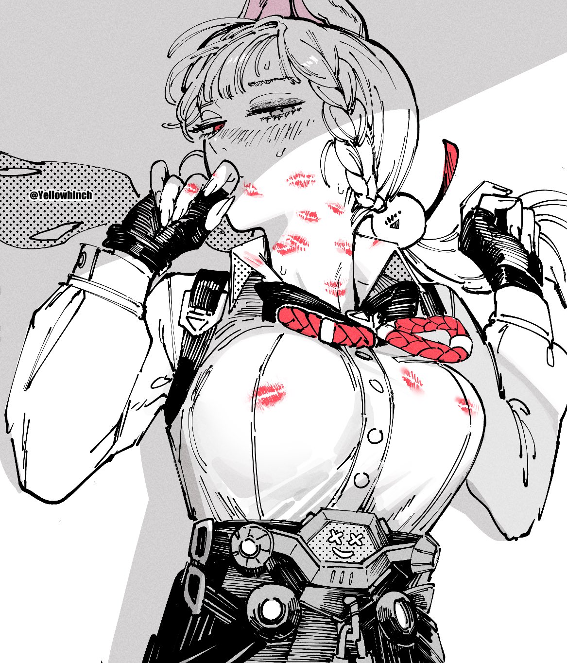 1girlanimal earsbeltblack glovesblushbreastschest bowfingerless glovesglovesgreyscalehair ornamenthalf-closed eyesheterochromiaimplied yurilipstick marklipstick mark on breastlipstick mark on facelipstick mark on handlipstick mark on neckmonochromerabbit earsrabbit girlred eyesshadowshirtsolosphere hair ornamenttwintailstwitter usernamewhite shirtyellow eyes