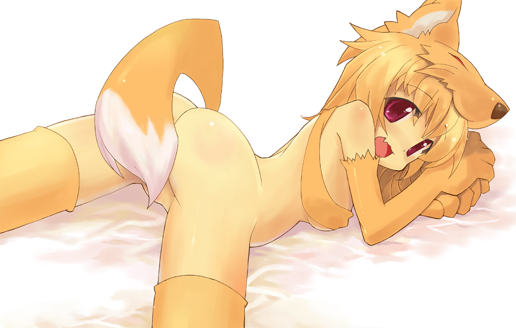 1girlanimal earsanimal handsblonde hairbottomlessbreastscensoredconvenient censoringelbow glovesfemale focusfox earsgloveshatno pantiesred eyessolotailthighhighs