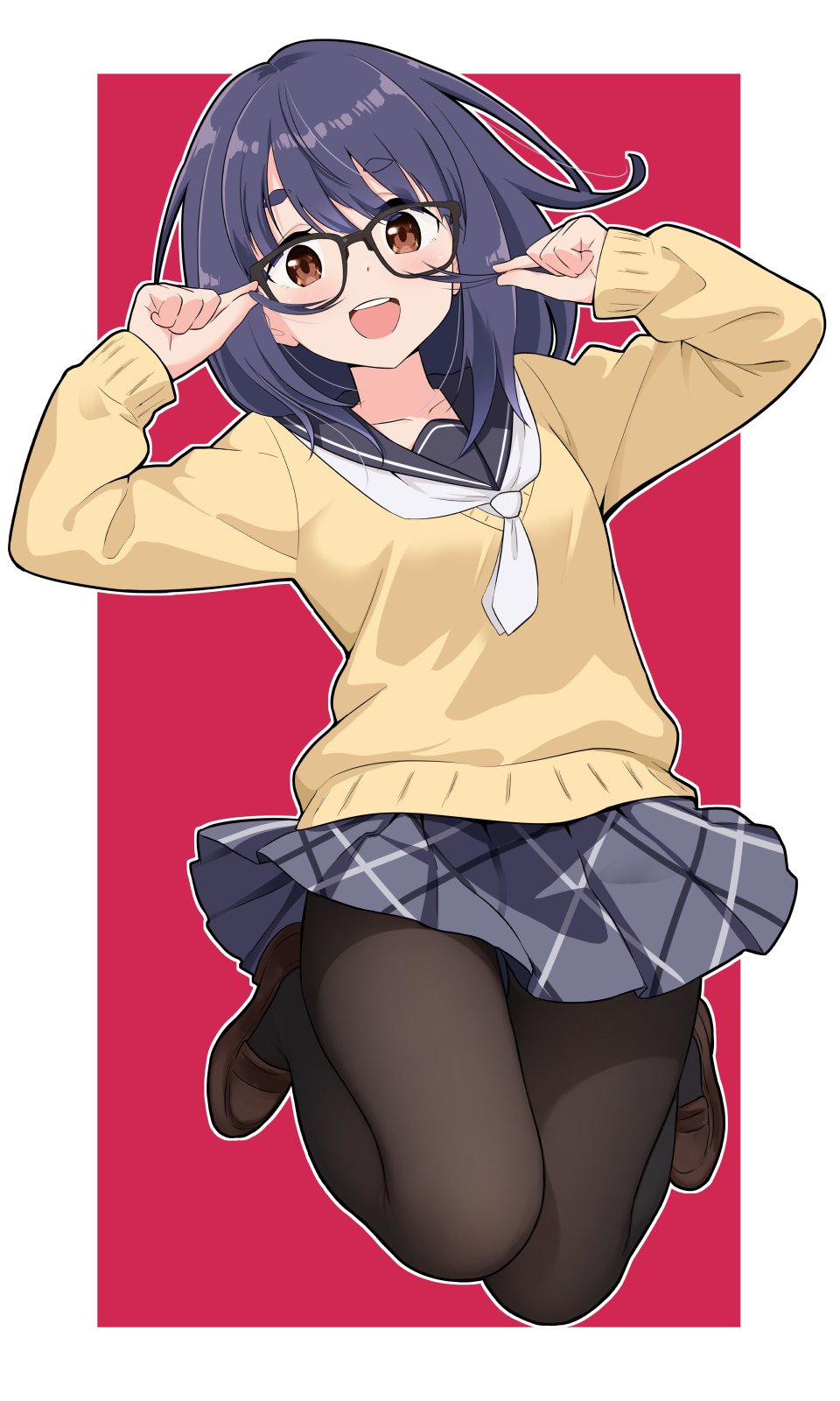 :d1girlblack pantyhoseblack-framed eyewearblue hairblue sailor collarblushborderbrown eyescollarbonefull bodyglassesjumpingloaferslong sleeveslooking at viewermedium hairmotosu school uniformneckerchiefopen mouthoutlineoutside borderpantyhoseplaid clothesplaid skirtplaying with own hairpleated skirtred backgroundsailor collarschool uniformshoesskirtsmilesolosweaterteethupper teeth onlywhite borderwhite neckerchiefwhite outlineyellow sweater