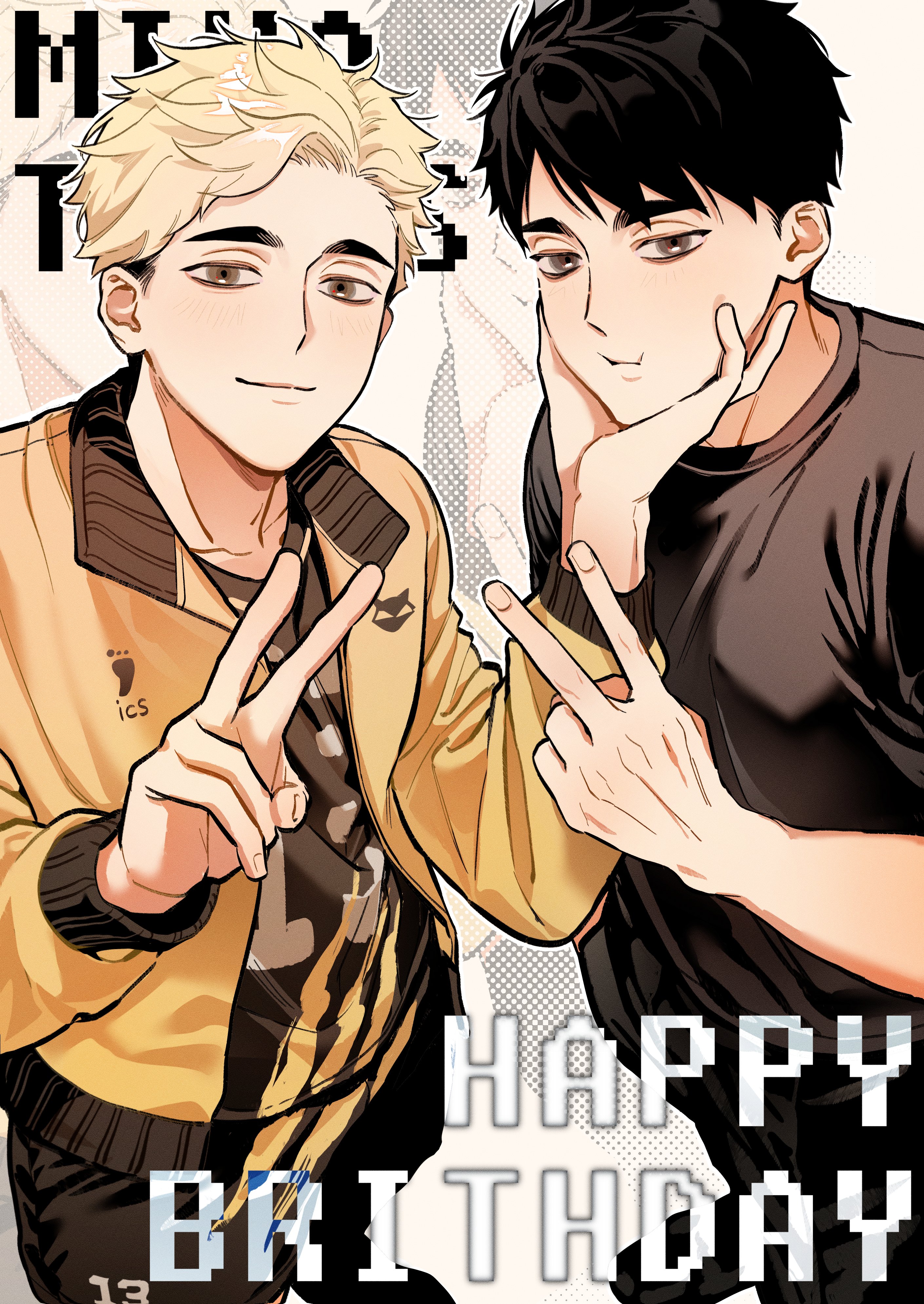 colorful palette, aoyagi touya, sena izumi (ensemble stars!), ensemble stars!, project sekai, game cg, highres, official art, third-party source, 2boys, alternate costume, belt, black belt, black gloves, black shirt, blue eyes, blue hair, blue theme, collared shirt, crowd, gloves, glowstick, grey hair, headset, lower teeth only, male focus, multicolored hair, multiple boys, parted lips, penlight (glowstick), shirt, split-color hair, star (symbol), teeth, tongue, two-tone hair