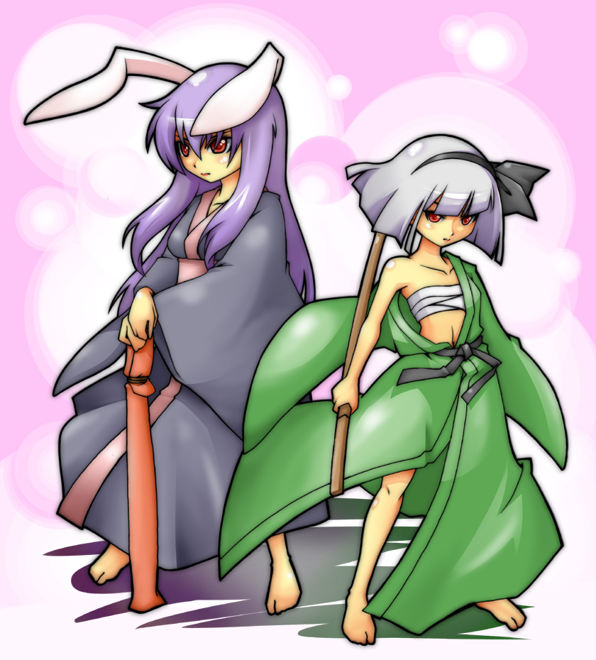 2girlsanimal earsbarefootfemale focushairbandjapanese clotheskatanalong hairmultiple girlsopen clothesopen robepurple hairrabbit earsred eyesrobesarashishort hairswordweapon