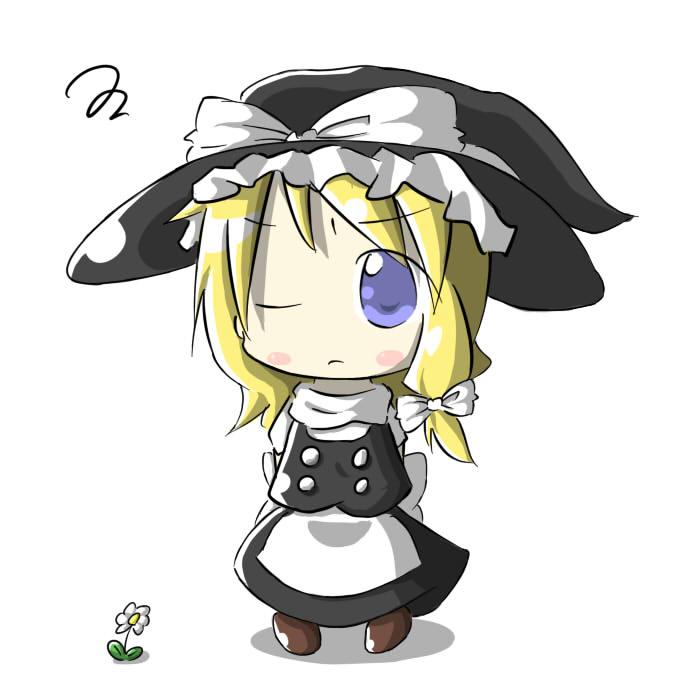 1girlchibifemale focusflowerfull bodyhatone eye closedplantsimple backgroundskirtsolowhite backgroundwinkwitchwitch hat