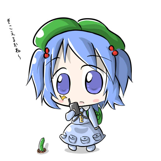 1girlbackpackbagblue eyesblue hairchibicucumberfemale focusfull bodyhair bobbleshair ornamenthatkeymatching hair/eyesplantrandoserushort hairsimple backgroundskirtsolotwo side upwalkie-talkiewhite background