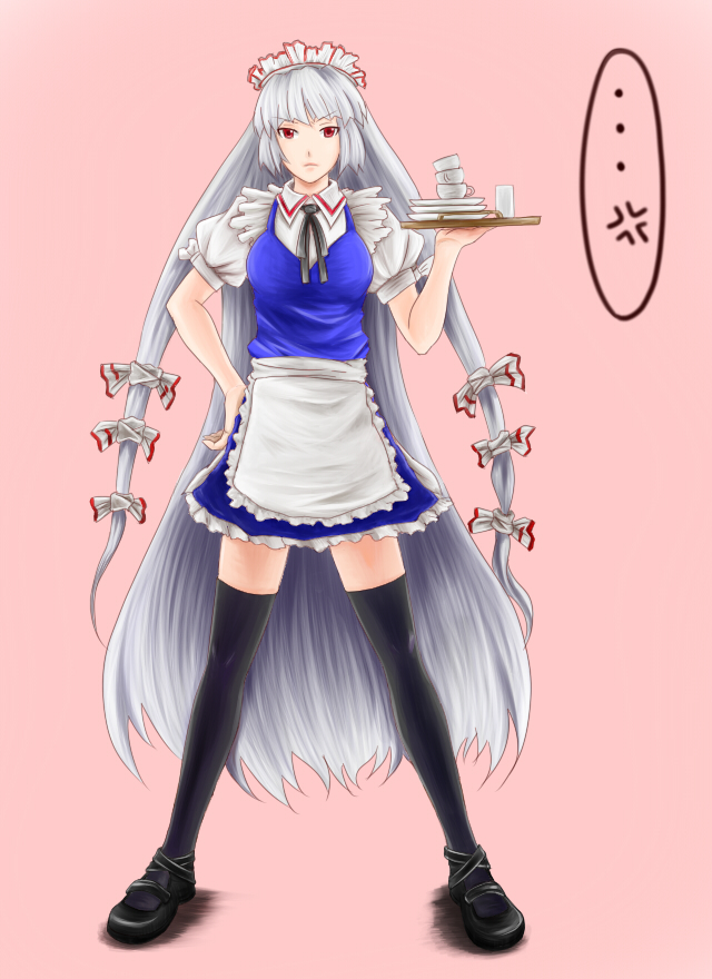 1boy1girlalternate costumeanger veinaproncosplayenmaidedfemale focushair ribbonizayoi sakuya (cosplay)long hairmaidmaid apronmaid headdressmulti-tied hairred eyesribbonsolothighhighstrayzettai ryouiki