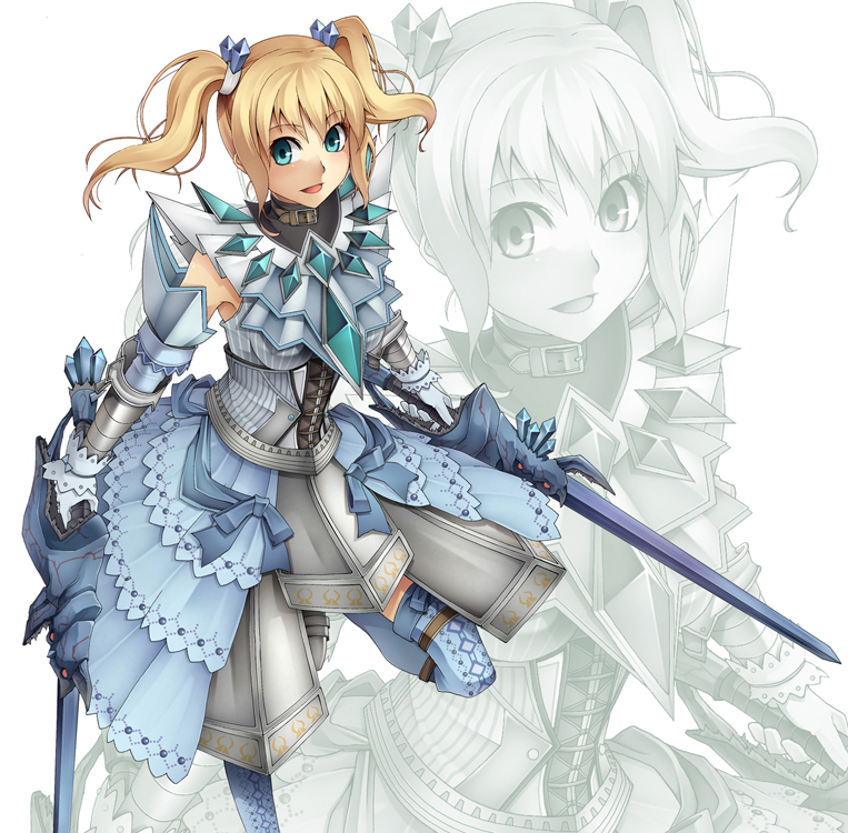 1girlaqua eyesarmorblonde haircrystaldressdual wieldingelbow glovesfemale focusglovesholdingsoloswordthighhighstwintailsweaponzoom layer