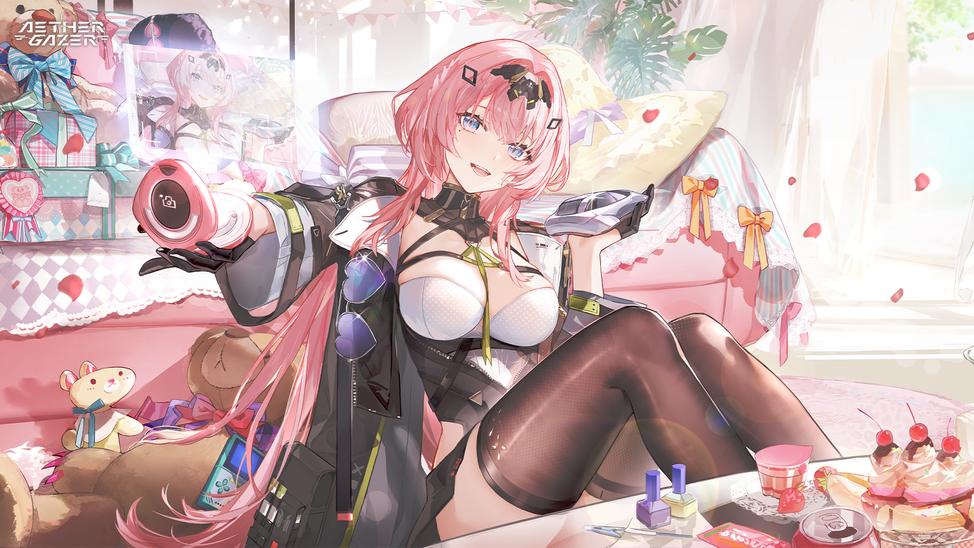 kurono (game illustrator), arabica, brown legwear, 3girls, copyright name, dutch angle, food, fruit, logo, long hair, maid, multiple girls, orange (fruit), orange background, orange eyes, orange hair, siblings, sisters, thighhighs, triplets
