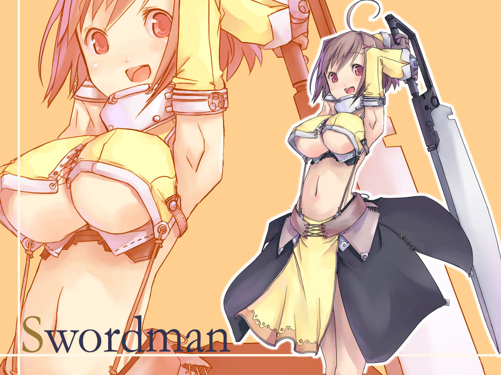 1girlahogearmpitsbeltbreastsbrown hairdetached sleevesfeet out of framefemale focusfront-tie topholdingholding weaponlarge breastsnavelopen mouthred eyesshort hairsimple backgroundskirtsolostandingswordunderboobupper bodyweaponyellow backgroundzoom layer