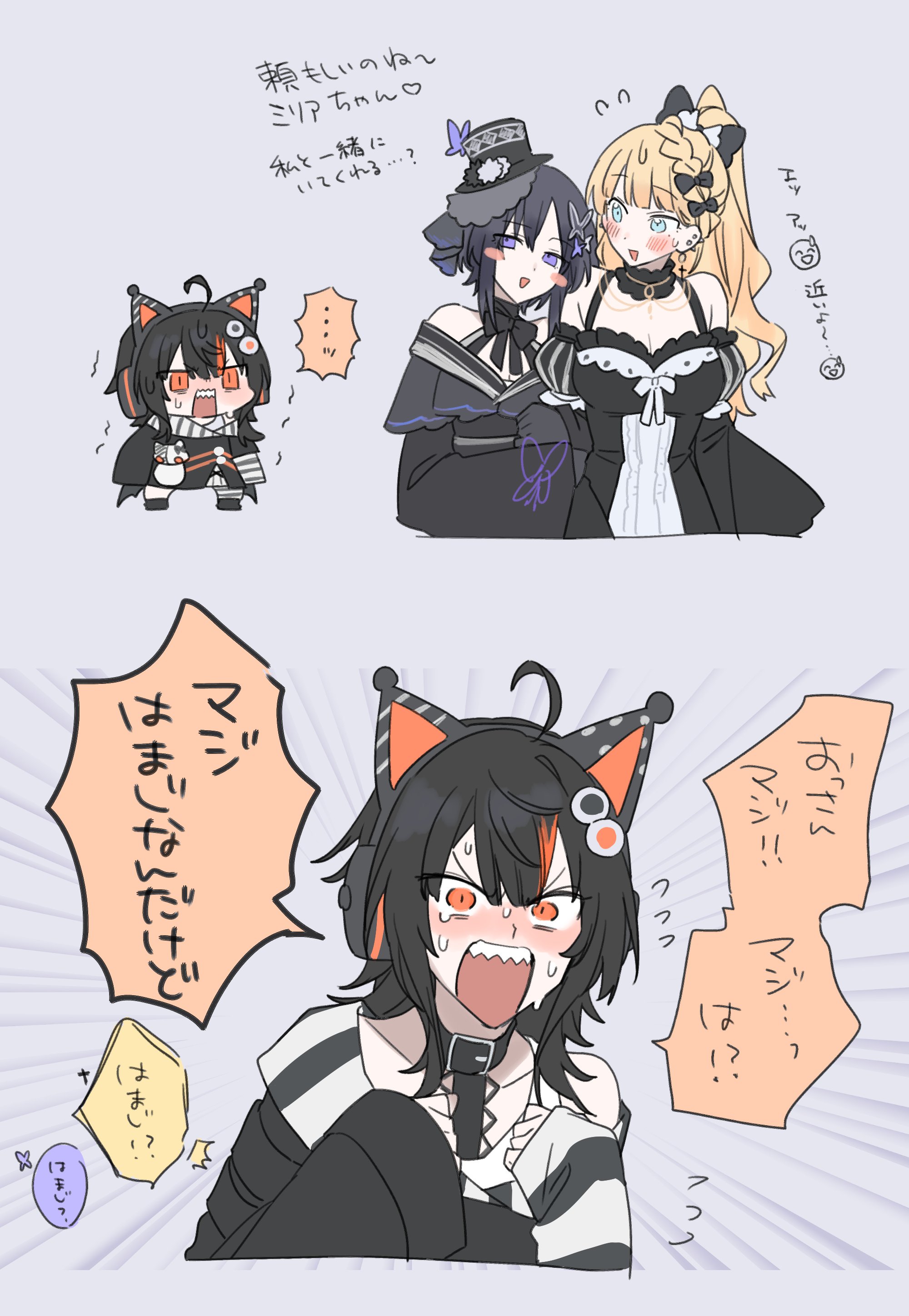 exe (artist), xe (execut3r), izayoi sakuya, remilia scarlet, touhou, silver hair, translated, 2girls, apron, black bow, black bowtie, blue dress, blush, bow, bowtie, dress, female focus, looking at viewer, mini person, minigirl, multiple girls, red eyes, simple background, size difference, tareme, text focus, twintails, white background