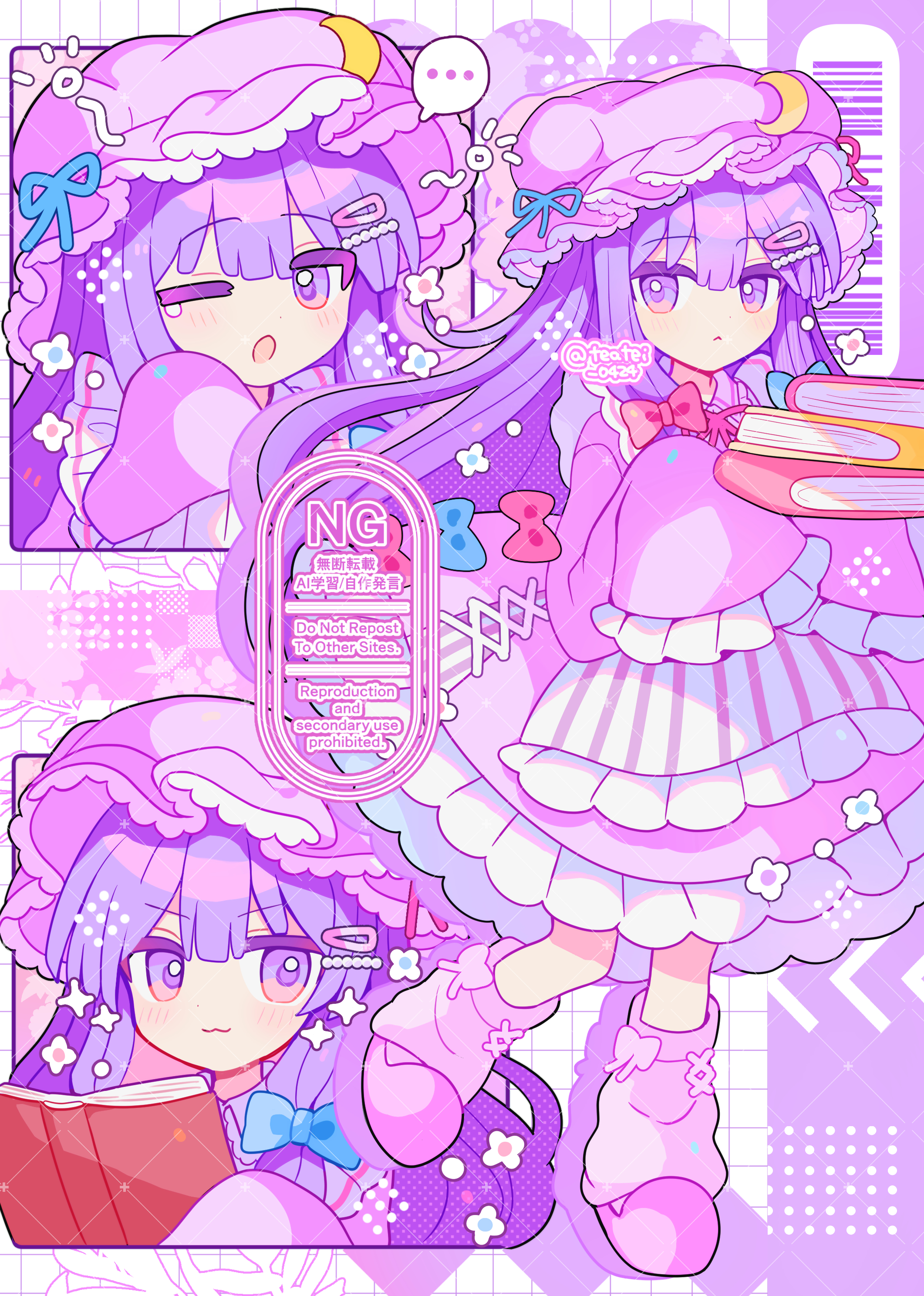 :3:o1boy1girlapronbarcodeblushbookclosed mouthcrescentcrescent hat ornamentdressfrilled apronfrilled dressfrillsfull bodygrid backgroundhair ornamenthaircliphand uphathat ornamentholdingholding booklong hairlong sleeveslooking at viewerloose socksmob capmultiple viewsone eye closedopen bookopen mouthpink dresspink slipperspink sockspurple eyespurple hairpurple hatsleeves past fingerssleeves past wristsslipperssocksspoken ellipsisstandingstriped apronstriped clothestearing uptwitter usernamev-shaped eyebrowswatermarkwhite apronwhite background