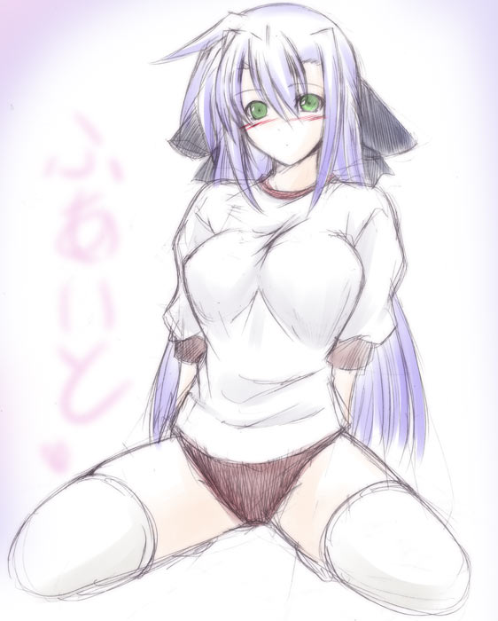 00sblushburumagreen eyesgym uniformhair ribbonkneelinglong hairpurple hairribbonsketchsolospread legsthighhighs