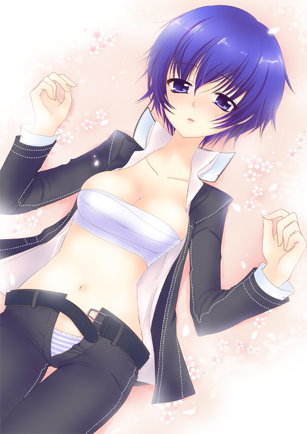 tsuutenkaaku, 1girl, breasts, cleavage, female focus, greyscale, hat, large breasts, long hair, monochrome, outline, panties, smile, solo, sports bra, twintails, underwear, underwear only