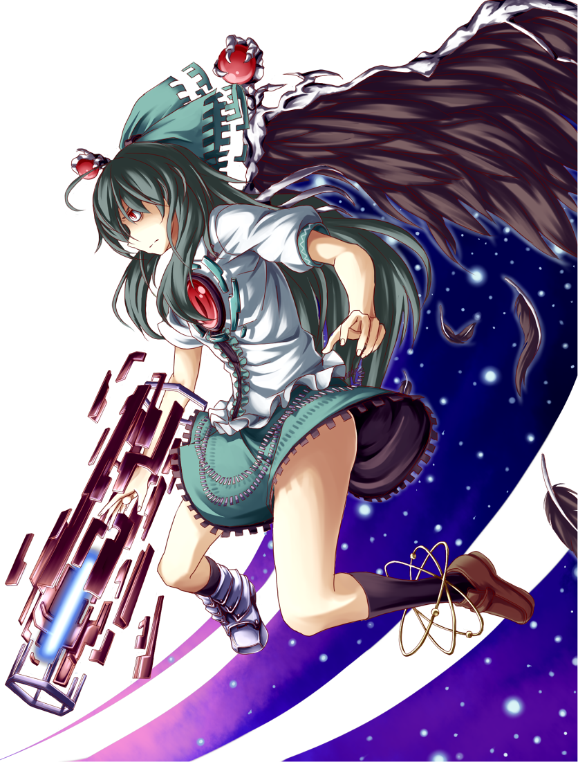 1girlalternate weaponarm cannonasymmetrical footweardigital dissolvefeathersfemale focusgreen hairlong hairmismatched footwearred eyesskirtsockssoloweaponwings