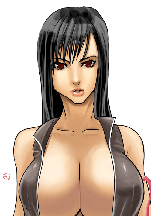 00s1990s (style)1girlbare shouldersblack hairbreastsbrown eyescleavagefemale focushuge breastslong hairno braretro artstylesimple backgroundsolo