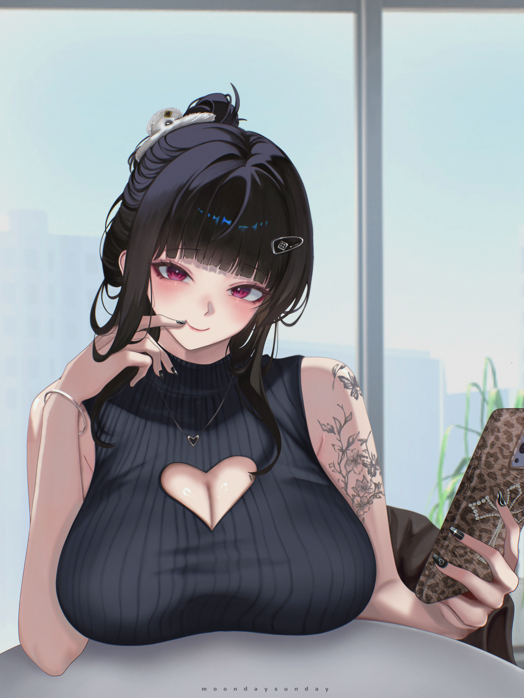 1girlarm tattooblack hairblack nailsblack sweaterblunt bangsblushbreastscellphonecleavagecleavage cutoutclosed mouthclothing cutoutholdingholding phonelarge breastslong hairlooking at viewerphoneponytailred eyessidelockssleevelesssleeveless turtlenecksmartphonesmilesolosweatertattooturtleneckturtleneck sweater